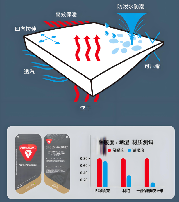 Primaloft 最初是為美國陸軍研發,旨在模擬羽絨的保暖性,同時克服羽絨潮濕后保暖性驟降的缺點。它的核心優勢包括: