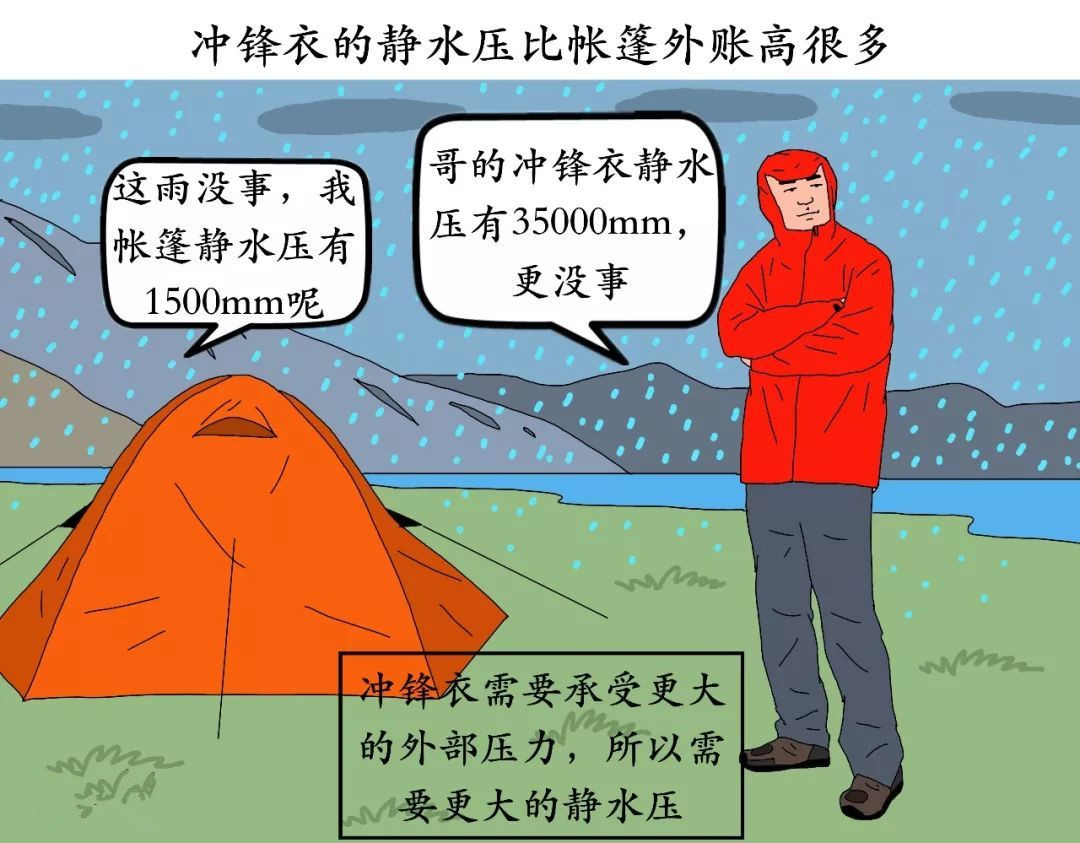 如果你仔細觀察帳篷的參數(shù),會發(fā)現(xiàn)它們只有1200~5500mm的靜水壓值即可抵御雨水侵襲,而沖鋒衣則需要13000mm以上的靜水壓,這背后的原因就在于兩者所承受的外部壓力不同。