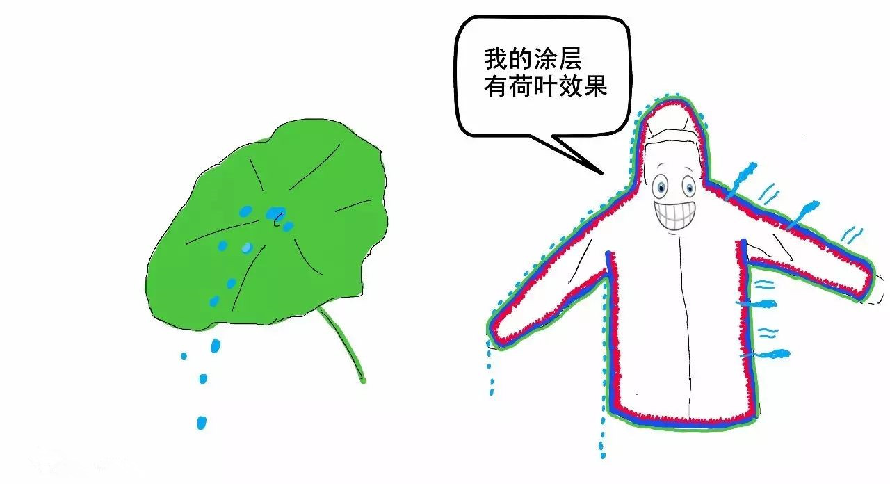 涂層可以實現“荷葉效果”,讓水珠滾落,同時水蒸氣能從面料縫隙排出。