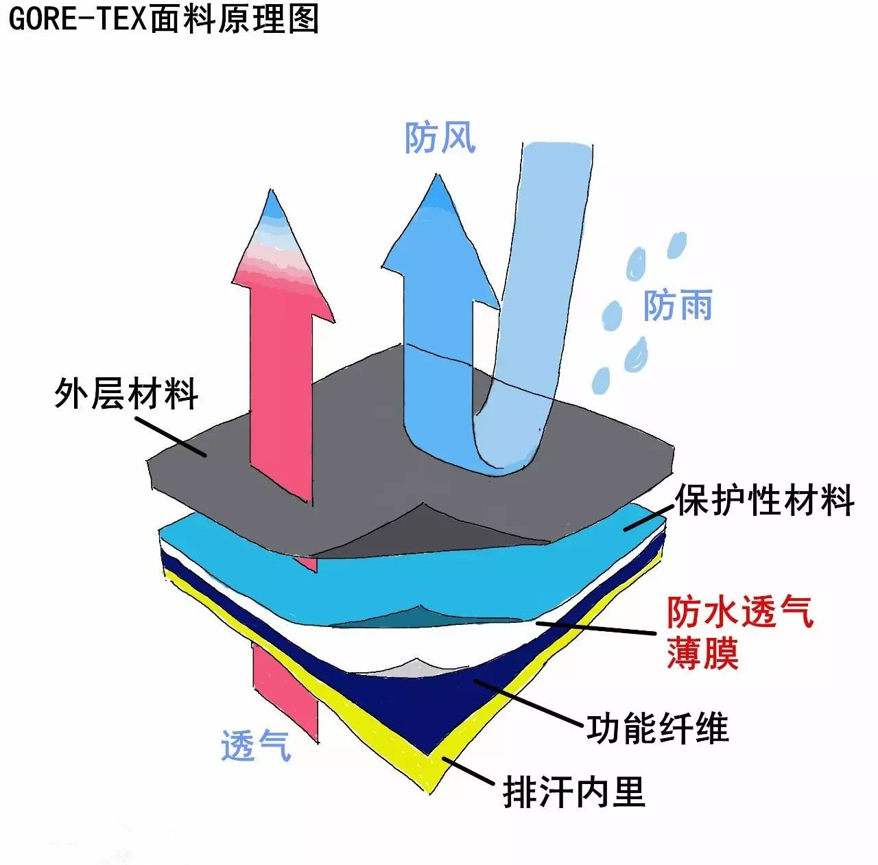 所以,市場(chǎng)上各個(gè)品牌的沖鋒衣面料,防水透氣原理都相同,主要區(qū)別在于薄膜不同。