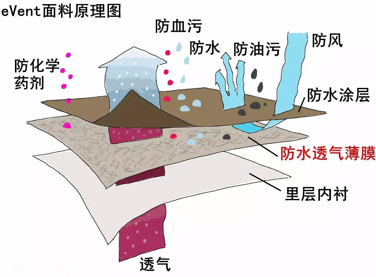 伊文特(eVent)面料起步于1999年,薄膜同樣采用ePTFE材料為基礎(chǔ),防水透氣核心依靠的仍然是薄膜。