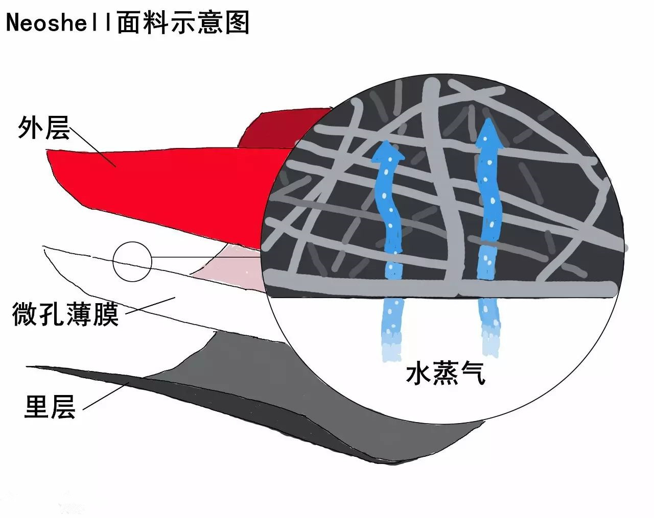 尼奧盾( Neoshell)面料由亞微米級(jí)別的纖維構(gòu)成,屬微孔薄膜,也就是小孔更為細(xì)密,因此防水透氣效果更好。2011年由著名的抓絨面料公司保羅塔克(Polartec)研制。