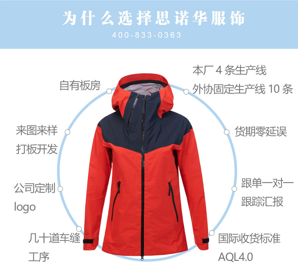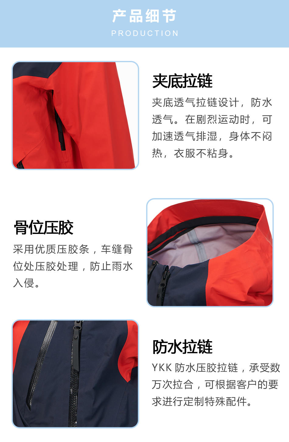防水拉鏈:單層沖鋒衣生產使用YKK防水壓膠拉鏈,承受數萬次拉合,可根據客戶的要求進行定制特殊配件。