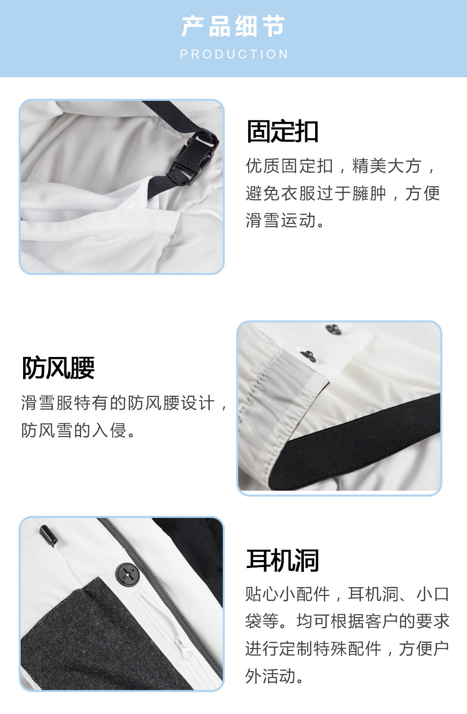 固定扣:優(yōu)質(zhì)固定扣,精美大方,避免衣服過(guò)于臃腫,方便滑雪運(yùn)動(dòng)。